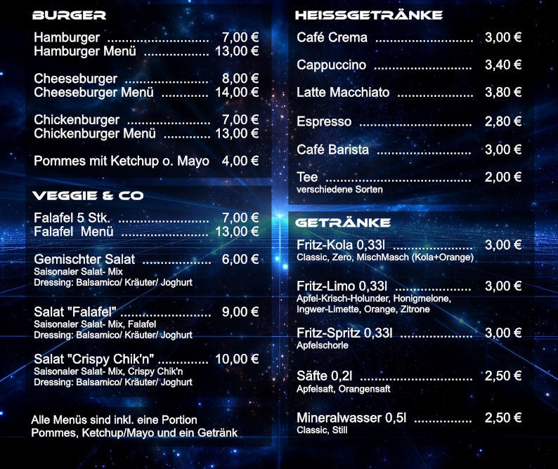 Ob du deine Energie für das nächste Level auffrischen oder einfach kurz entspannen willst – bei uns findest du alles, was du brauchst. Genieße herzhafte Klassiker, knackige Pommes, erfrischende Getränke oder eine cremige Kaffeespezialität. Perfekt für Spieler jeden Alters, für Freundesgruppen oder die ganze Familie – damit der Spaß niemals auf der Strecke bleibt.